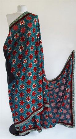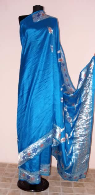 Sari din matase naturala bogat decorat cu broderii realizate din fir metalic argintiu.