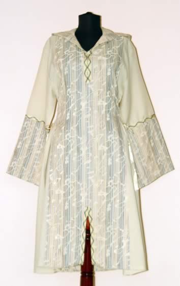 Djellaba din material tesut. In talie se strange in laterale cu snururi din matase.