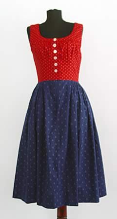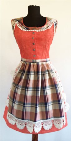 Dirndl din panza de bumbac. Corsajul se inchide in fata cu nasturi.