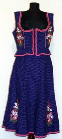 Dirndl din panza de bumbac, decorat cu broderii. Corsajul se inchide in fata cu nasturi.