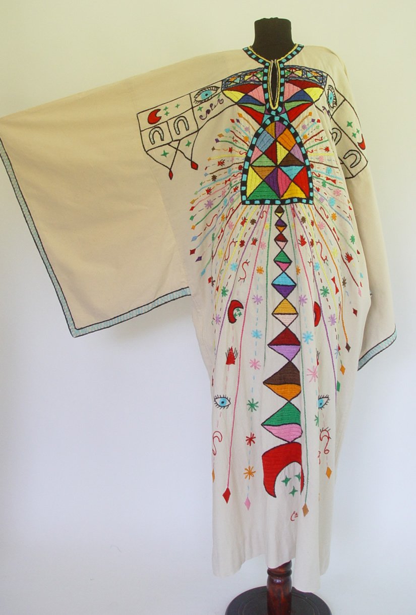 Kaftan din panza de bumbac. Este decorat cu diferite cusaturi realizate manual.