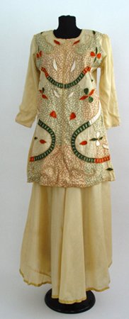 Lacha din matase naturala. Kurta este bogat decorata cu broderii din margele. Fusta "lehenga" este tivita cu panglica teseuta cu fir auriu.